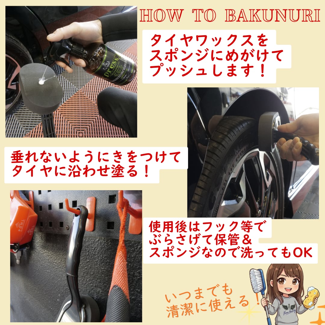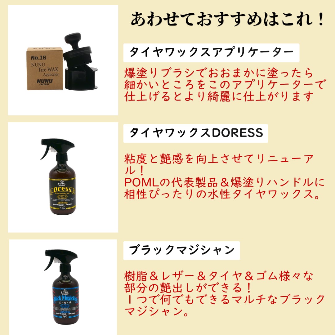 NUNU FACTORY自慢のタイヤワックス「ドレス」と組み合わせることで、その性能を120%引き出します。