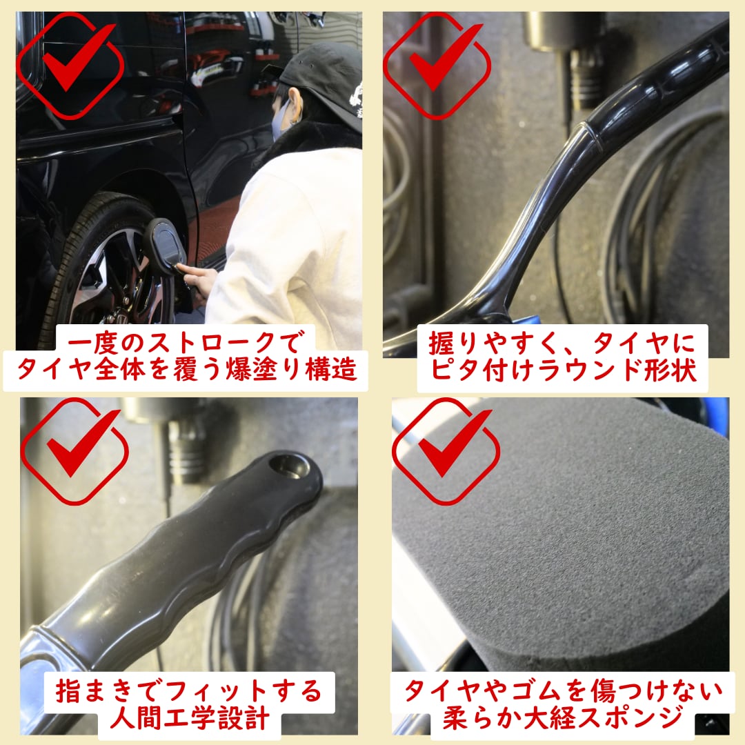 SUVや4WDなどの大型タイヤのワックス掛けは、時間がかかる上に手が汚れやすい重労働でした。そんな洗車オーナーの悩みを解消するために生まれたのが、この「爆塗りハンドル」です。